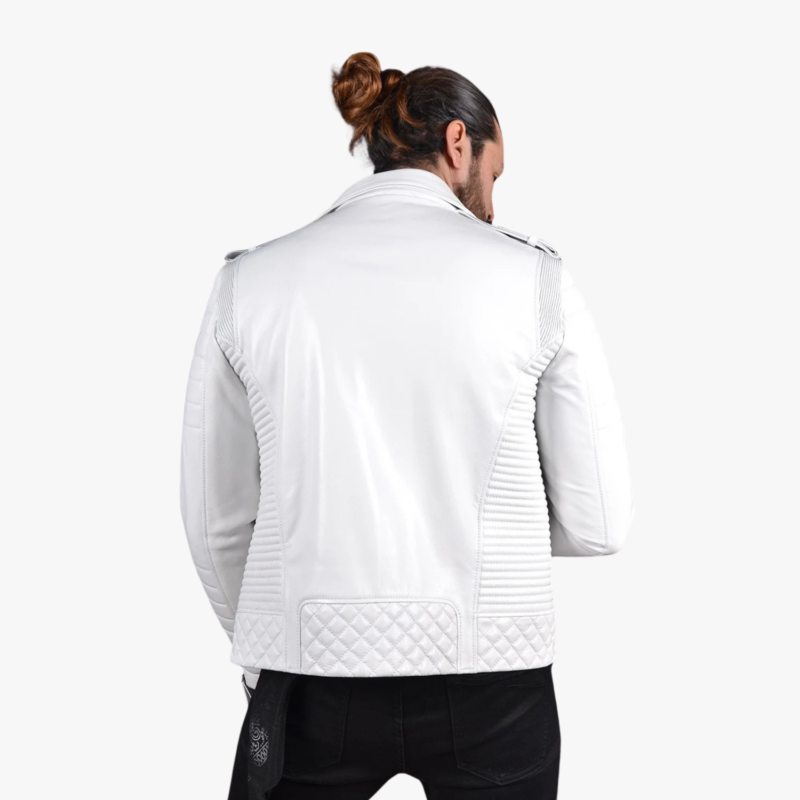 Handmade Mens Lambskin White Motorcycle BikerDouble Breast Quilted Leather Jacket