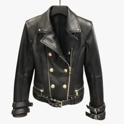 Handmade Women Black Lambskin Motorcycle Biker Leather Jacket With Stylish Button Designer Jacket