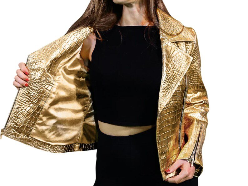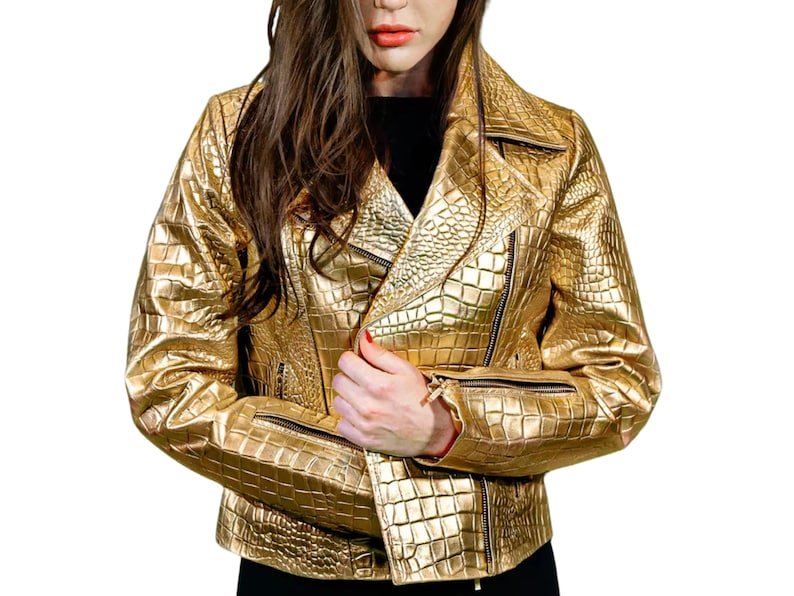 Leather Gold Biker Jacket – Women’s Cropped Motorcycle Jacket