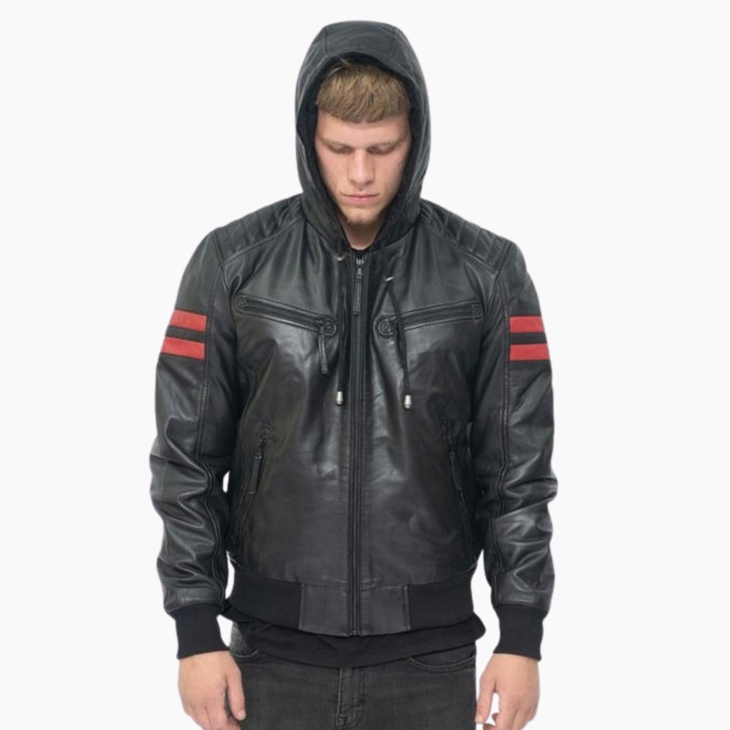 Real Genuine Hooded Leather Jacket With Zipper Black leather Jacket